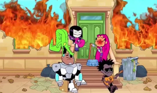 - The front door and steps that the Titans sit at while playing their instruments resemble those of the 123 building from Sesame Street. Nearby is a trash can with a skeletal arm that has green skin on it sticking out, alluding to Oscar the Grouch.