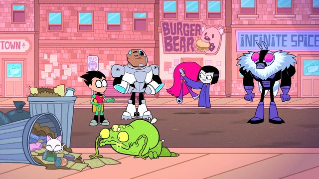 Killer Moth, on the back of a giant pill bug gloats that Jump City will fall before his might. Robin, Cyborg, Starfire, and Raven confront the villain, but Killer Moth takes note of the "new guy" who is eating trash on a sidewalk. Cyborg grabs the creature and reveals it's "Beast Boy", before extending his head through the streets, under the ocean, up the tower, and vomiting in the bathroom. Killer Moth jumps down from the giant pill bug to examine the bug up close and says it doesn't look like Beast Boy. The Titans all clamor and Raven accuses Killer Moth of being a jerk for identifying people based off their looks. Killer Moth asks how else is he supposed to identify people and the Titans clamor again. Starfire says that he should be focusing what's on the inside, but vomits inside Raven's hood when she notices the bug has returned to eating garbage. Cyborg agrees with Starfire, telling Killer Moth to get to know him only for the creature to consume a kitten. He detaches his head and vomits inside his body.