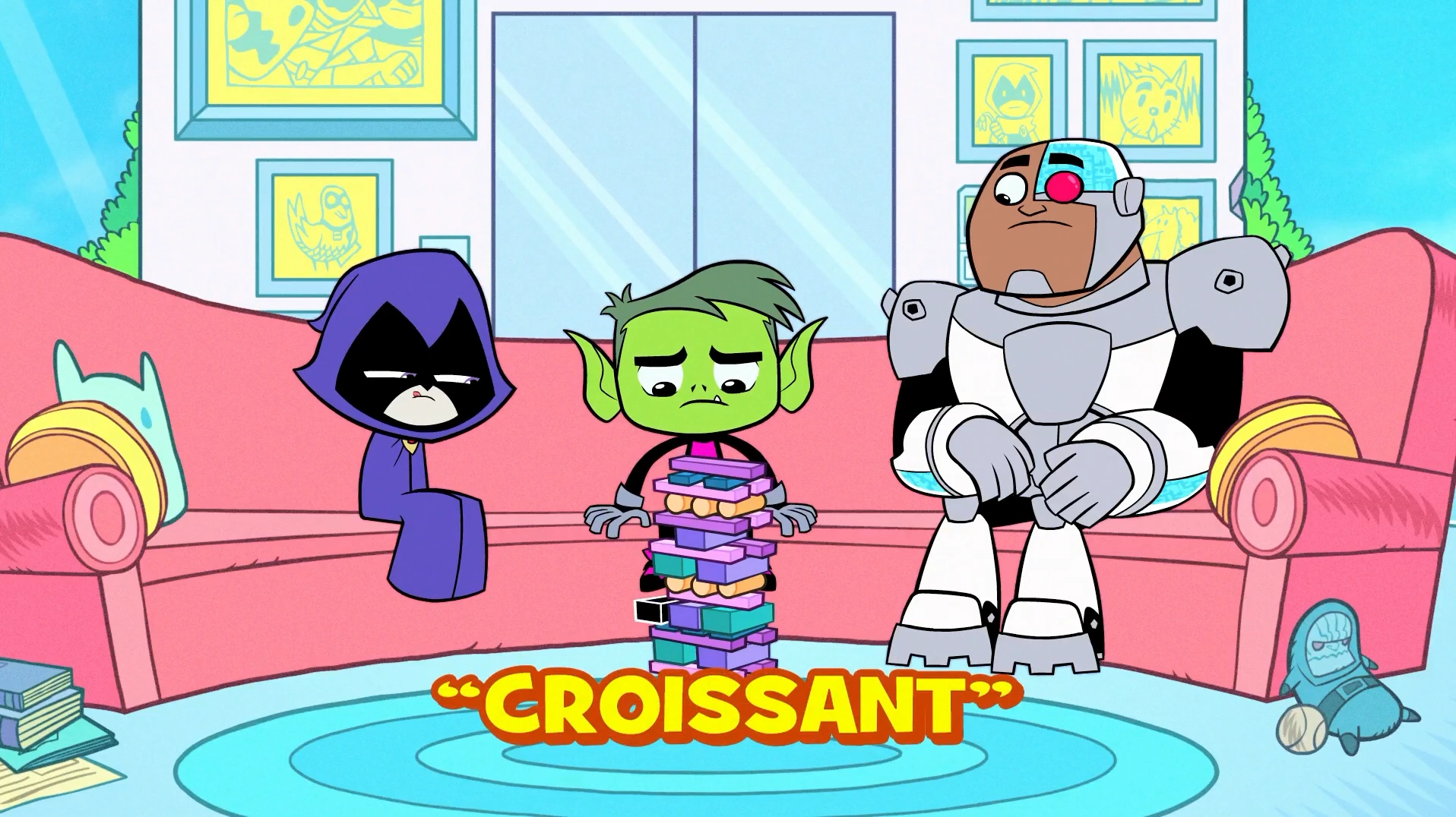 - Raven, Beast Boy, and Cyborg are seen playing Jenga at the beginning of the episode.