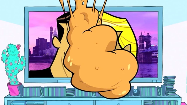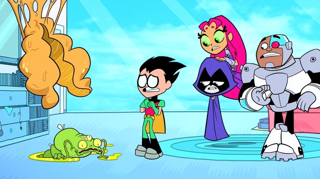 Starfire announces that the cocoon is opening and the Titans gather in amazement only to see a slimy, green bug plop out, disgusting them. The creature begins groaning and climbs up Robin's leg while the Titans complain about its appearance. Starfire demands the flamethrower in order to kill the bug, but Robin knocks it out of her hand as he reminds them that the creature is their "friend". Raven complains how gross he looks, and Robin repeats that looks don't matter. Starfire and Cyborg lower their weapons and Robin picks up the creature, saying that nothing's changed even when it vomits on him. He vomits and hands the bug to Cyborg, who extends his neck to the toilet and vomits. His head returns and Raven informs him that the bug is building a hive out of his fluids on Cyborg's back. The Titans begin retching until the crime alert blares. Robin moves the cocoon to view the screen and sees that the criminal is Killer Moth. He attempts to call the Titans into action, but vomits instead.