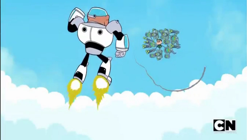 - Grappling Hook: Cyborg has a grappling hook in his arm, similar to Robin's one, which is used in "Nose Mouth".