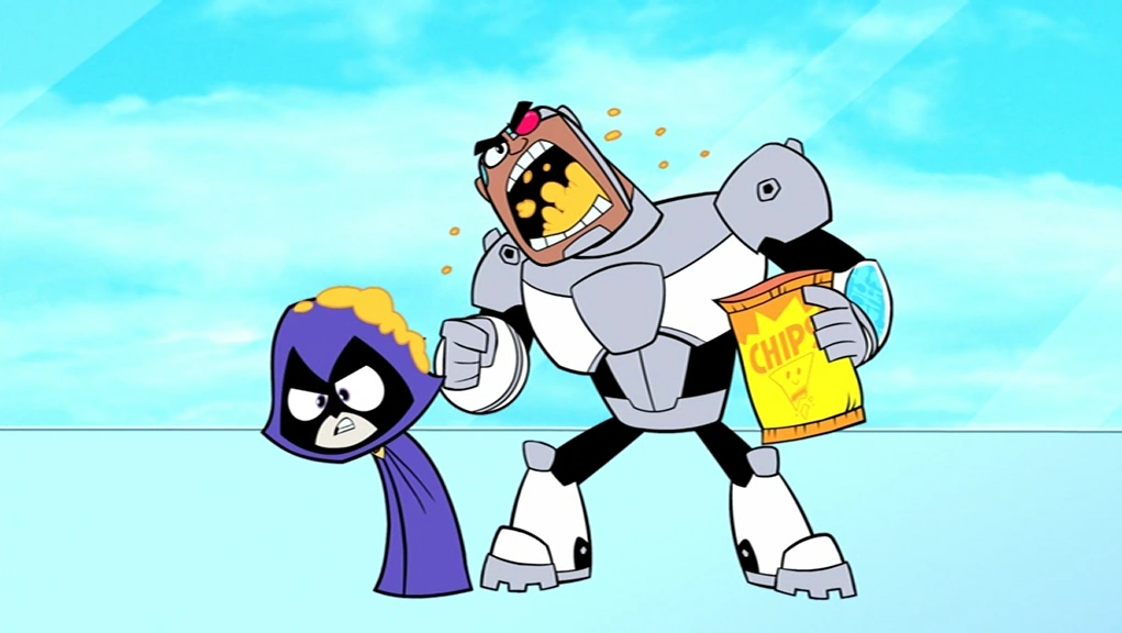 In Starliar, when Starfire lies to Cyborg about Raven saying he chewed to loudly, Cyborg becomes extremely resentful of her. He chews a bag of chips loudly and splatters it on her hood, before sarcastically asking if she was annoyed. Later on, they get into a huge fight, along with Robin.