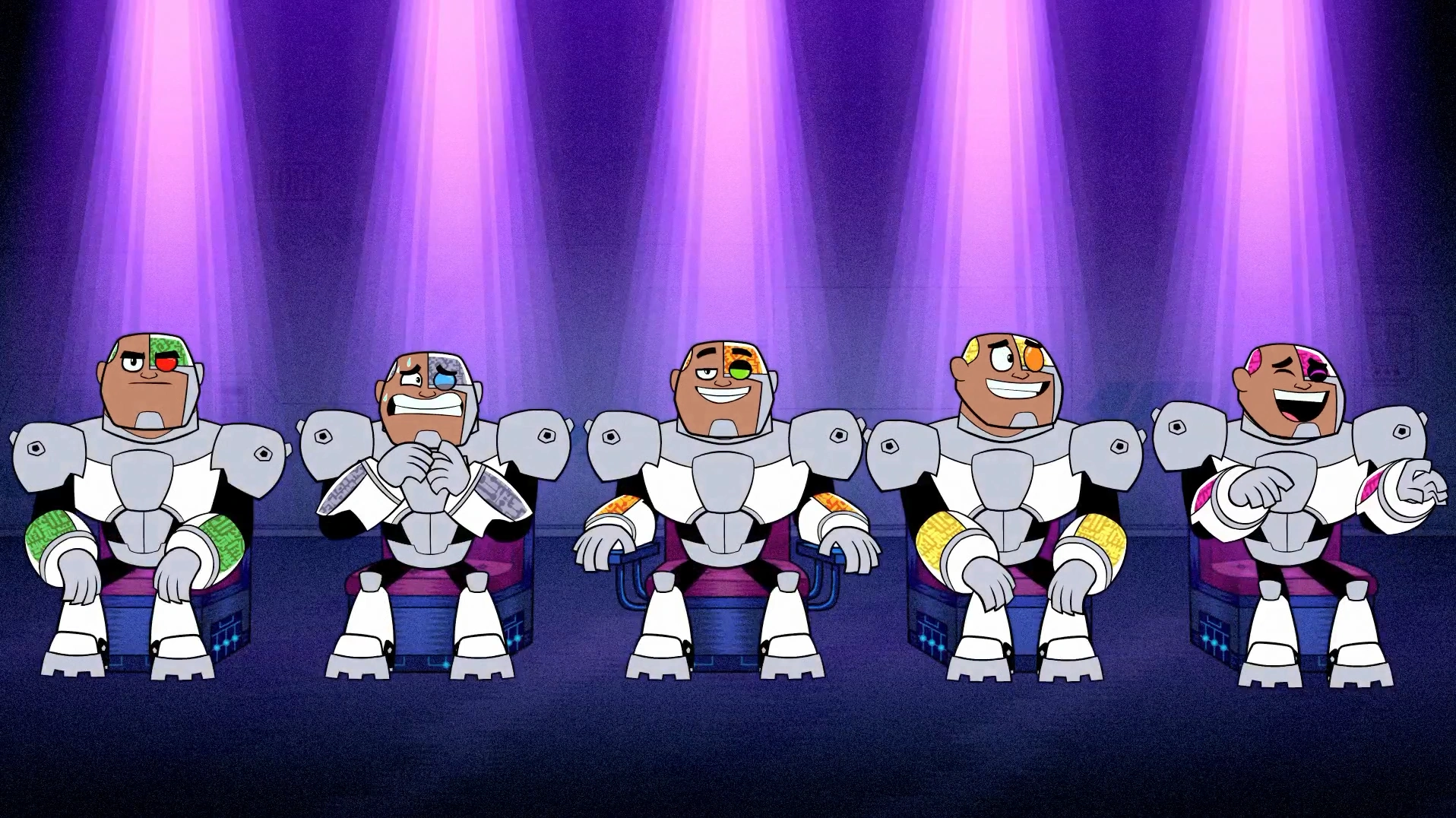 - Stereo system: Speakers pop out of Cyborg's shoulders, with the controls on his chest. Seen in "Nose Mouth" and "Grandma Voice". He can also play record discs.