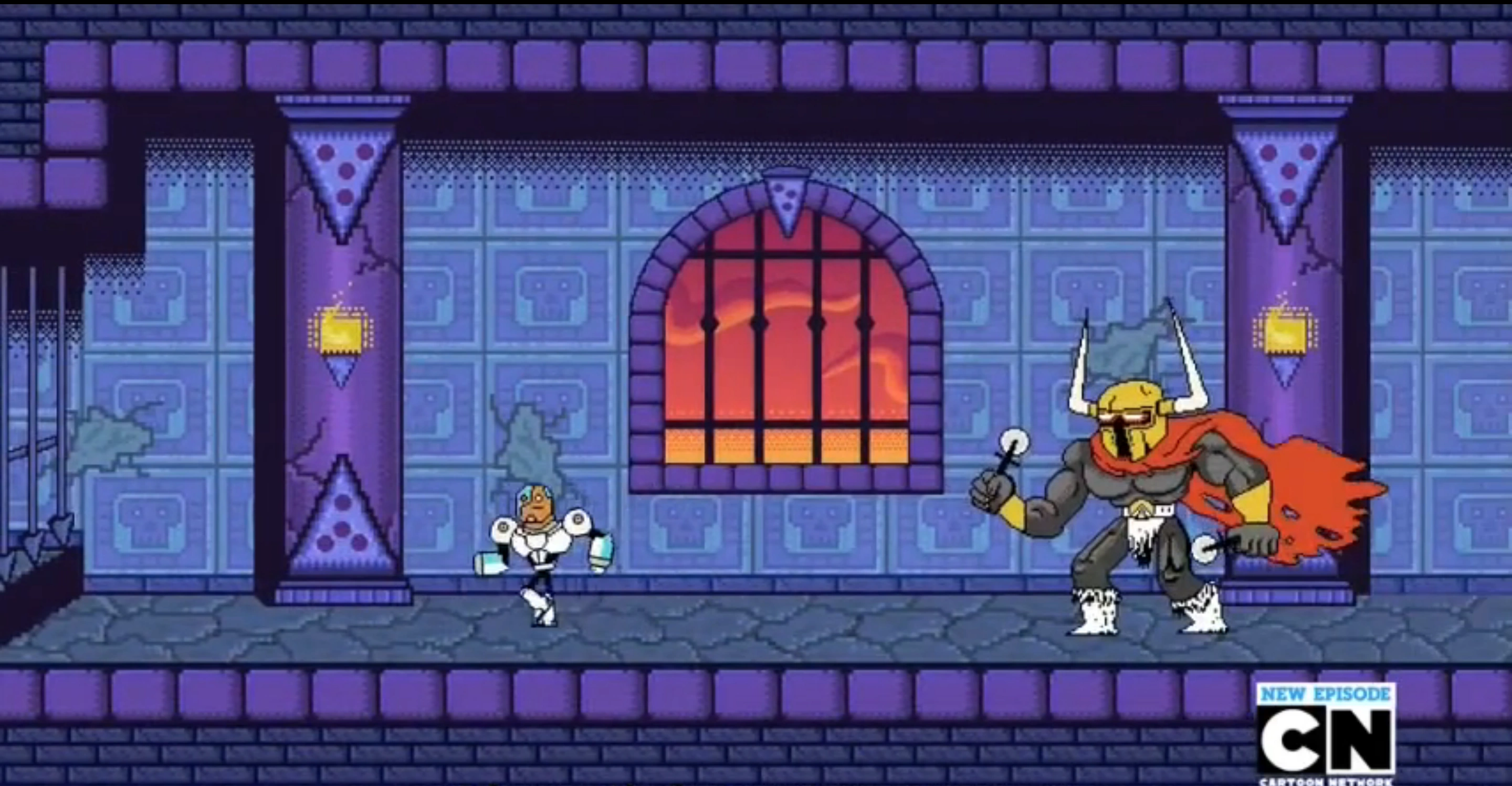 In Cyborg's "dream mode" (text on screen), Cyborg is in a side-scrolling, Game Boy Advance style game, where his mission is to get pizza for the hungry team. He jumps up on rooftops crawling with crabs and UFOs, shooting them out of his way and avoiding toxic chimney smoke (a reference to Birds). Cyborg has trouble crossing over a chimney at one point, but after eliminating a UFO, he passes through. He does a rolling move to defeat several crabs at once. The final boss is the Pizza Knight, a powerful and deadly Roman gladiator.