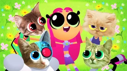 Starfire is happy because of how cute they all are that she begins playing with the cat-headed Titans, petting them and licking Raven.