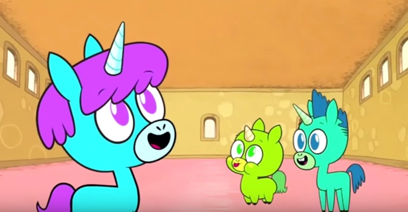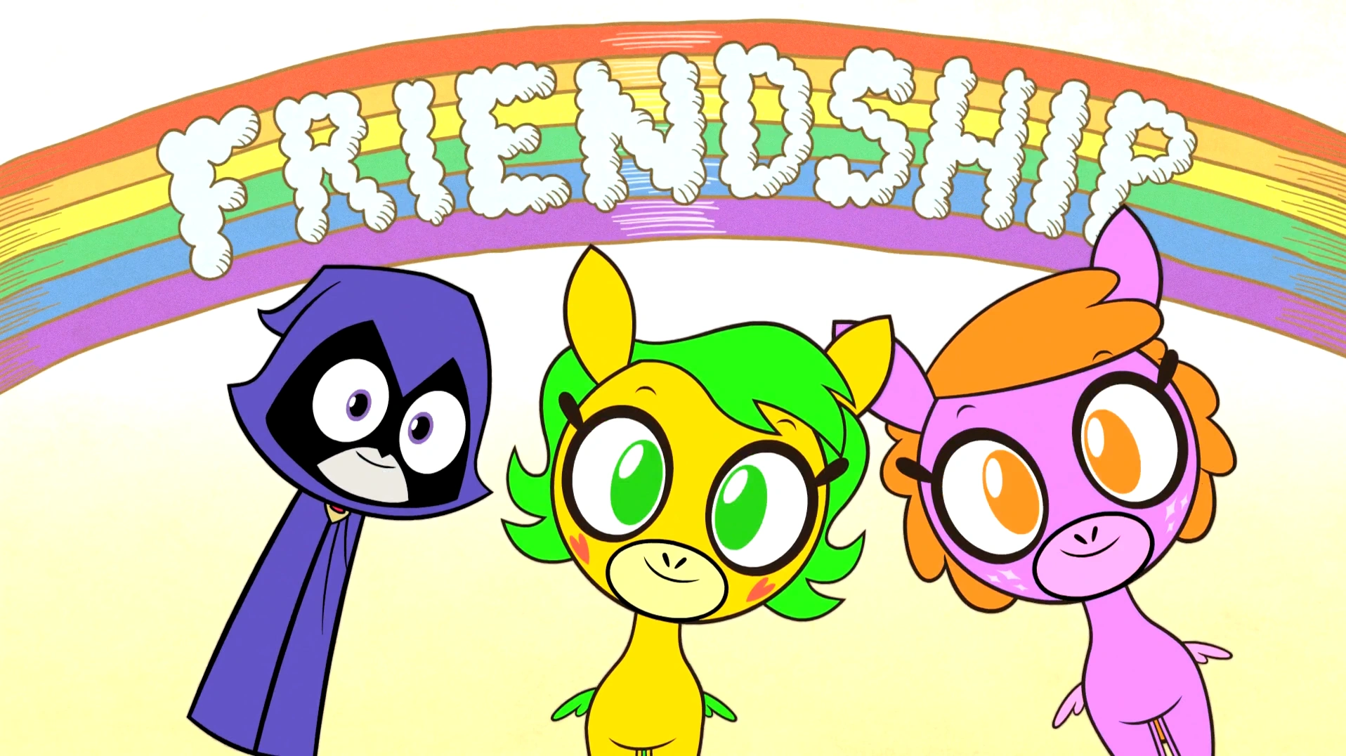 They approach a gate that leads to two Pegasi, Sparkleface and Butterbean. Raven wants to talk to them, but Robin doesn't allow her near them as he thinks Beast Boy should be the first to communicate with them. He weirdly turns into a disfigured horse with wings (which hints how he cannot turn into mythical creatures). Robin ignores the moaning and Beast Boy approaches the two Pegasi. They both are frightened at the hideous sight, but Raven pushes Beast Boy away and runs to the both of them. She introduces the Pegasi to the Titans and she begins geeking out again, making weird faces. Sparkleface is about to sing the Friendship Song, but Robin stops her in her tracks. They then tell the Titans that they have a problem of their own: the unicorns were playing very loud music; the Titans then agree to help them.