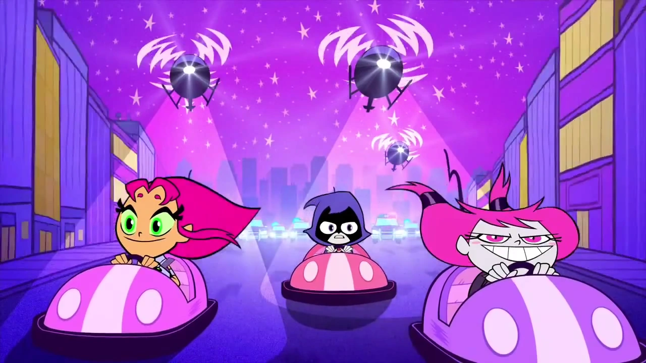 Meanwhile, Starfire takes the girls to an amusement park because the commercial for it said it was crazy. After Jinx helps them cut the line to the bumper cars, they get bored and Starfire admits she doesn't really know how to be crazy. After convincing her, Jinx gets Starfire to break her out of her handcuffs and she turns their bumper cars into fast getaway cars. They attract the attention of the police after speeding up their cars. After getting chased by the police, they knock over a building, and they all ride like a surfboard. After the building stops falling, the JCPD arrest them and put them in jail.