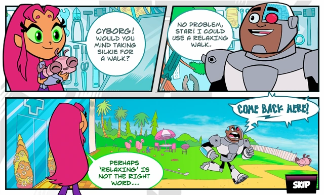 Starfire asks Cyborg if he would mind taking Silkie for a walk, Cyborg decides to take him for a relaxing walk. Silkie, however, escapes making Cyborg have to keep up with him and protect him.