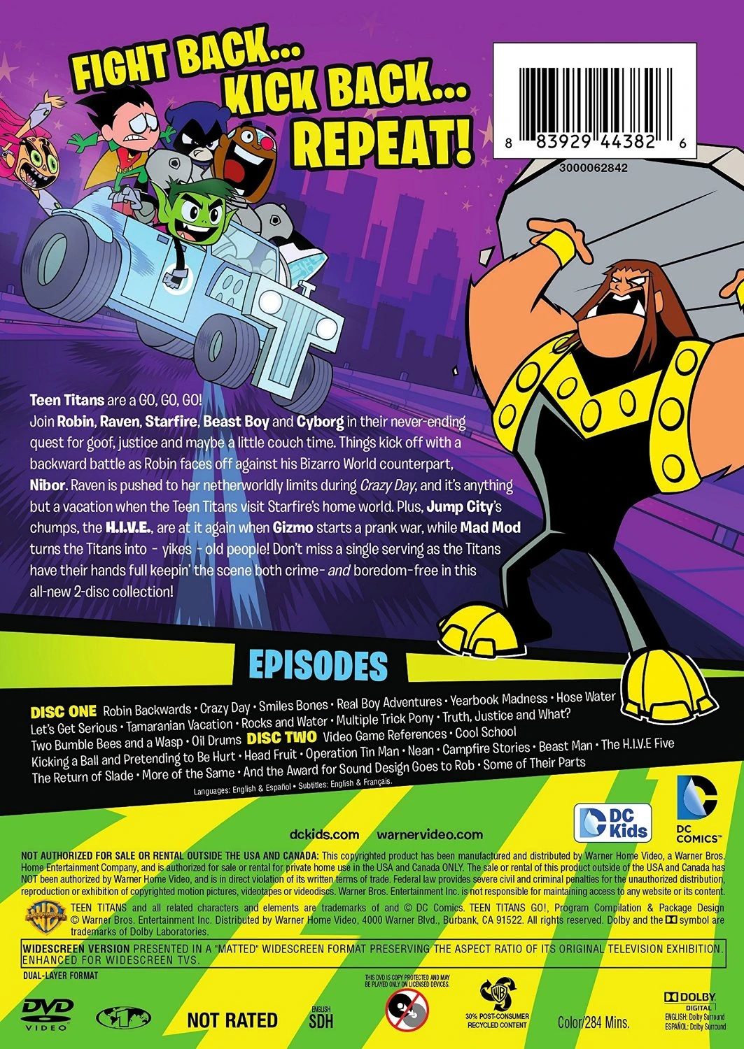 Teen Titans are a GO, GO, GO! Join DC Comics characters Robin, Raven, Starfire, Beast Boy, and Cyborg in their never-ending quest for goof, justice and maybe a little couch time. Things kick off with a backwards battle as Robin faces off against his Bizzaro World counterpart, Nibor. Raven is pushed to her limits during Crazy Day and it’s anything but a vacation when the Teen Titans visit Starfire’s home world. Don’t miss a single serving as the Titans have their hands full keepin’ the scene both crime-free and boredom-free in this all-new 2-disc collection!