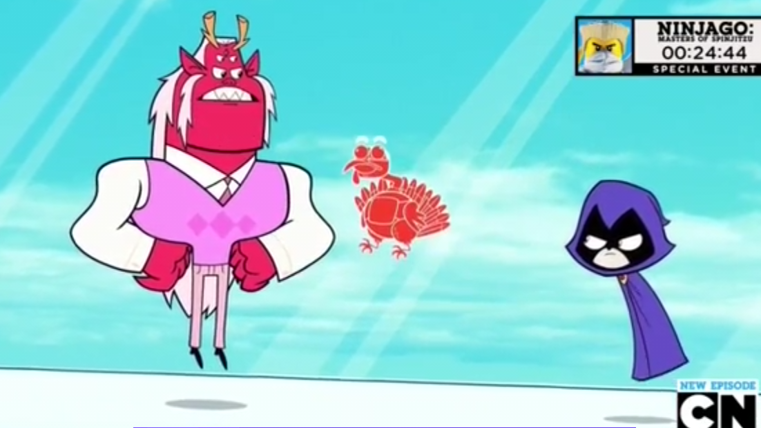 In "Legendary Sandwich", the boys annoy Raven by eating messily and getting crumbs on her. She complains that they "eat like animals", before seeing Beast Boy in pig form and says he gets a pass.