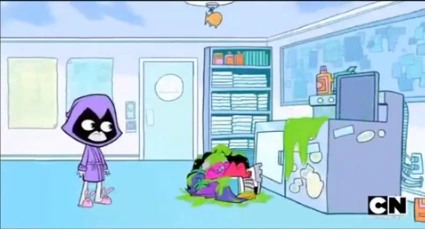 While she was doing the laundry (which it was actually Robin's turn), she wears a bathrobe with a hood similar to her cloak and pink bunny slippers. She curses the Titans' clothing on purpose to come to life and attack the Titans themselves. This results in her wearing Robin's uniform.