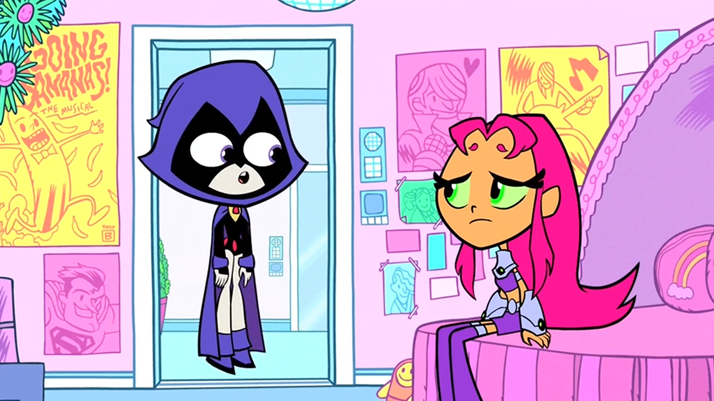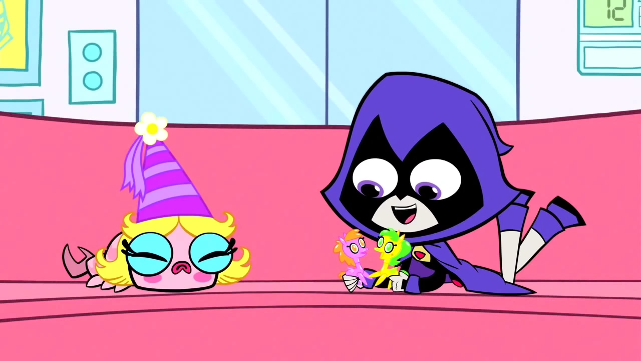 She also seems to hate going to the dentist, as shown in the episode "Meatball Party." She generally dislikes things that are considered "girly", but considers Pretty Pretty Pegasus a sort of guilty pleasure (Tara Strong, Raven's voice actor, is the lead voice for a similar show, My Little Pony: Friendship Is Magic. PPP is a reference to this.) At first, she didn't seem to want the other Titans to know that she's a fan of the show, but in "Super Robin", she has apparently gotten over this, as she is seen watching it in front of them. In the episode "Friendship", Raven becomes uncharacteristically joyful when Control Freak transports her (along with the rest of the Titans) into an episode of Pretty Pretty Pegasus. In "Halloween", she dresses up as a Pretty Pretty Pegasus and is optimistic about the holiday, while the other Titans aren't, a sort flip flop in personalities.