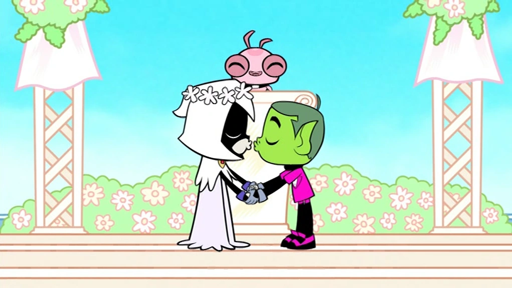 Beast Boy and Raven about to share a kiss on their wedding day.