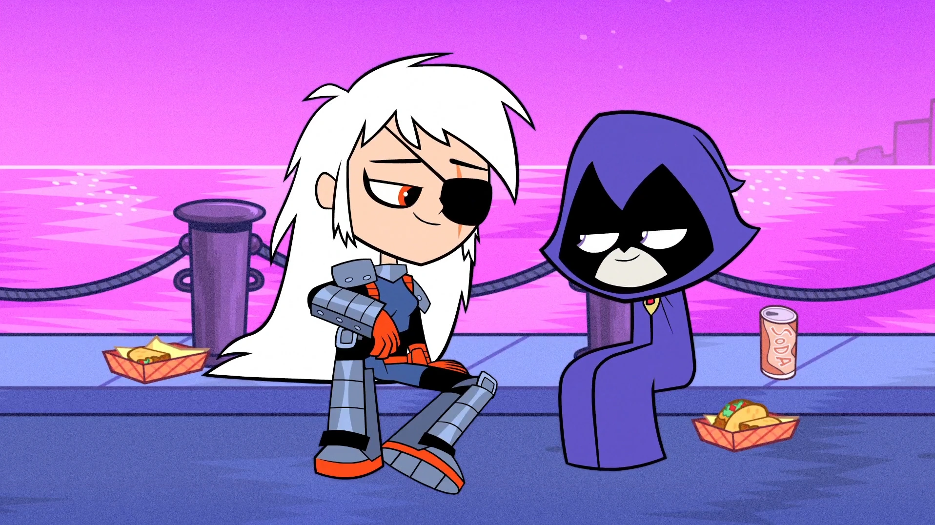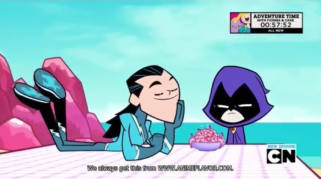 In "Pirates", Beast Boy said that Raven was "his girl" numerous times throughout the episode and has shown extreme jealously towards Aqualad, implying that he actually does have genuine romantic feelings for her. Until this episode, Beast Boy was shown to mostly have a physical attraction towards Raven, but then he shares more on what he personally likes about her, by stating that he thinks her darkness is cool but likes the light inside her even more. Raven later made Beast Boy and Aqualad "fight to the death". While Aqualad was not willing to fight Beast Boy to the death, Beast Boy on the other hand, unleashed his rage and gave no mercy on him, nearly killing him in the process. After the fight, Raven floated over to Beast Boy and gave him a kiss on the forehead in admiration on how intense he was fighting for her. However, Beast Boy was already passed out and he was unaware of this action from Raven.