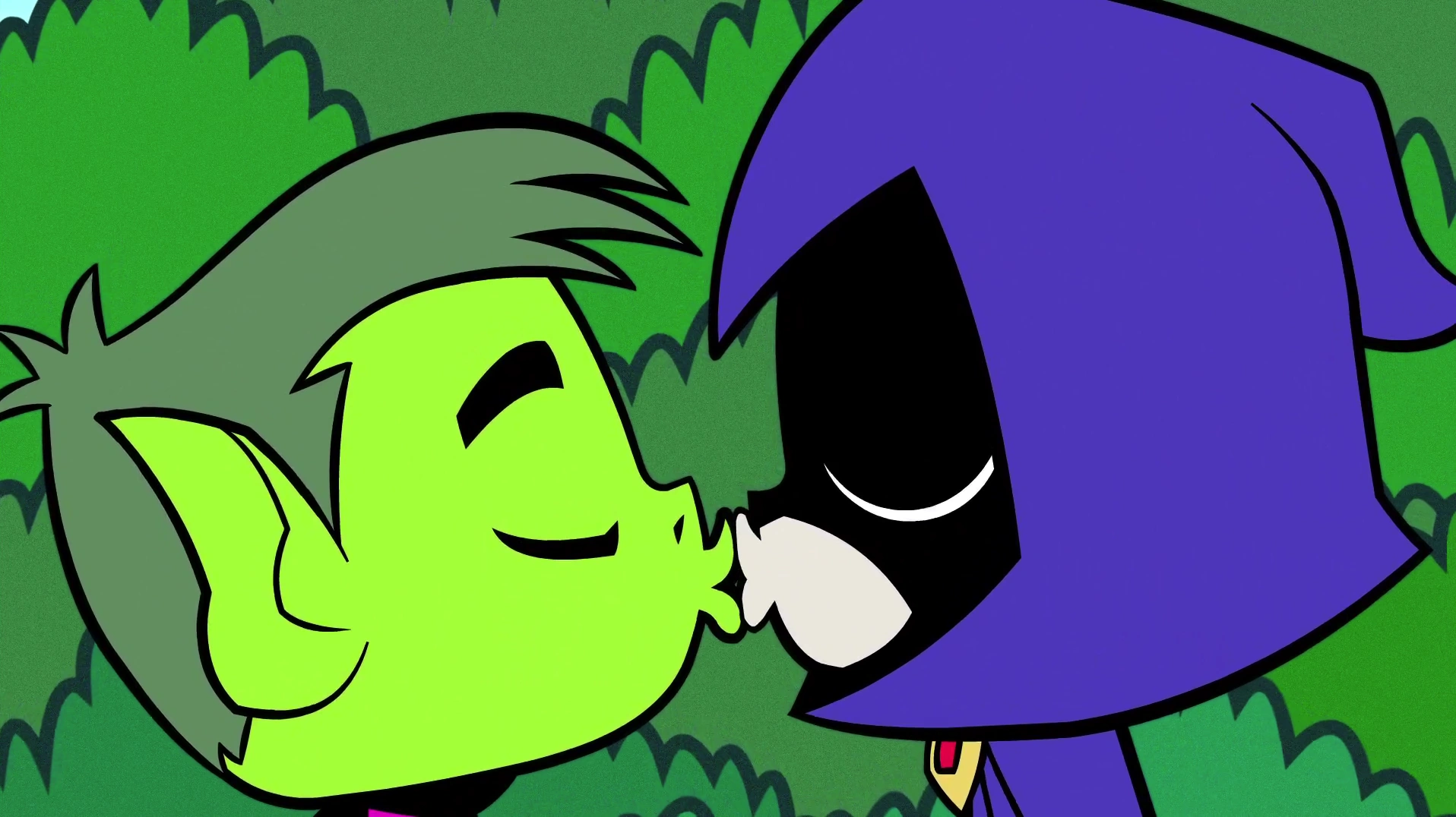 Beast Boy and Raven sharing their first kiss.