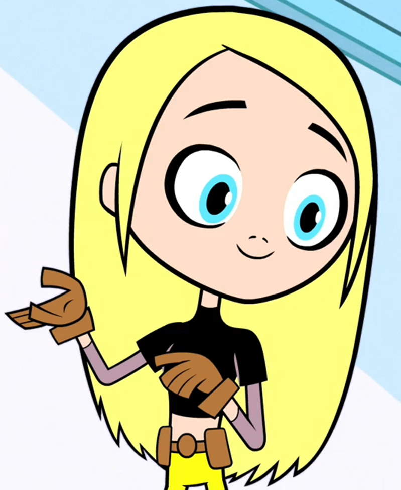 Terra is a tall, pale, teenage girl, with blonde hair. She wears a black short-sleeved shirt, that ends just above her navel. She also wears short yellow shorts, a thick brown belt with a circular buckle, and a pouch on both sides of her hip. She also wears gloves and boots of the same color. She has big, sky-blue eyes. Her mouth design is slightly similar to Robin's.