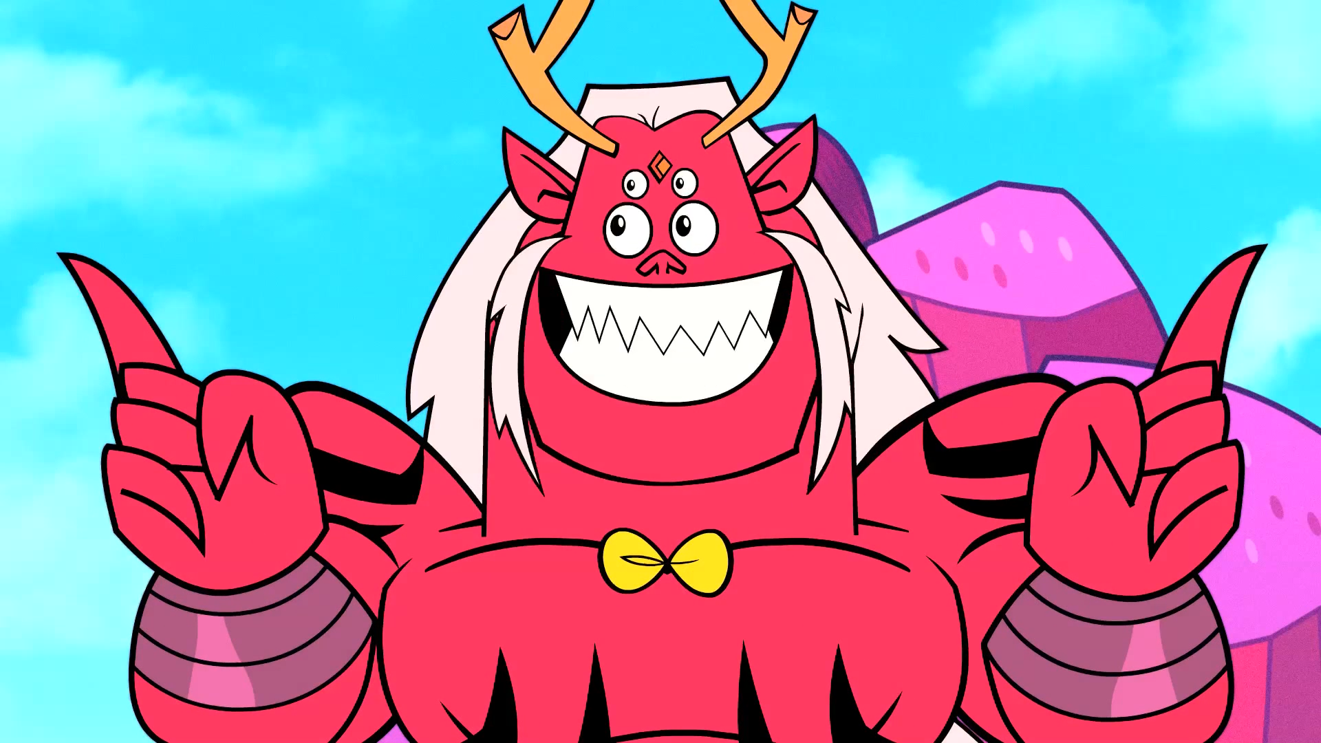 He normally doesn't wear much clothing other than chain mail like armor on his waist and a pair of silver wrist bands. However, on formal occassions, he wears a pink sweater vest and white collared shirt. He can change his size at will, shrinking himself down to the size of a larger than average human.